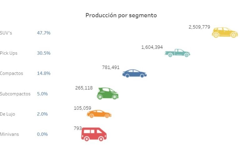 De todos los vehículos que se producen en el país, el 47.7% pertenece al segmento de los SUV’s, mientras que el 30.5% a de los pick-ups, 14.8% a los compactos, 5.0% a los subcompactos, 2.0% a los autos de lujo y menos del 1.0% a las minivans.