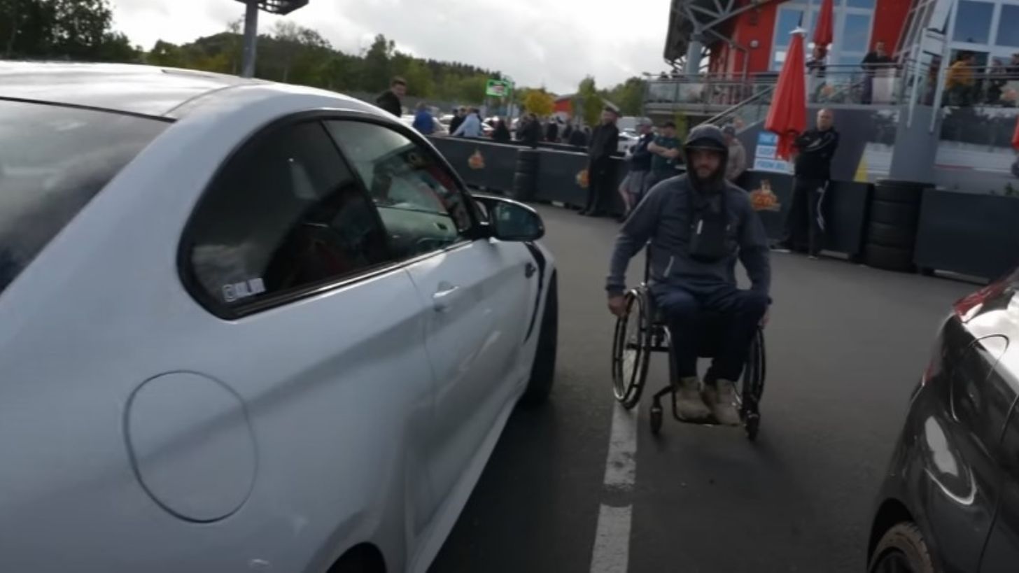 Misha Charoudin hizo la grabación de esta vuelta del BMW M2, al darse cuenta que lo rebasó previamente y está modificado al interior para que solo pueda ser conducido con las manos, al igual que el acceso desde la silla de ruedas sea sencillo de lograr.