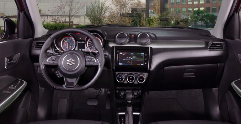 Como parte de sus mejoras para el modelo 2023, el Suzuki Swift incluye nuevos insertos en color gris, vidrios y seguros eléctricos, controles de audio, manos libres, volante forrado en piel, ajuste de altura, ajuste de profundidad, puerto USB, conexión para cable auxiliar y aire acondicionado automático.