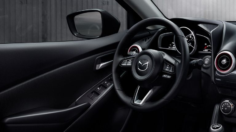 El auto más barato de Mazda incluye un botón de encendido automático, espejos de vanidad con cubierta para conductor y copiloto, luces de lectura, seguros eléctricos con función automática, toma corrientes de 12V, vidrios eléctricos, y volante con ajuste de altura y profundidad.