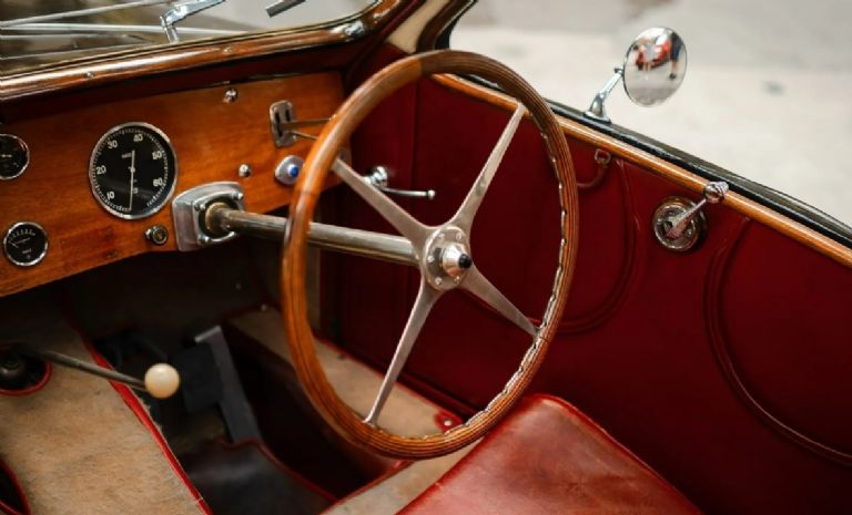 Además, al interior tiene la tapicería de cuero, posee un tablero de madera con relojes analógicos y un volante de cuatro radios, también de madera en el exterior.