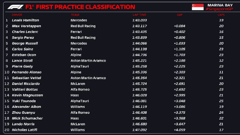 En las primeras prácticas libres para el Gran Premio de Singapur de la Fórmula 1, llevadas a cabo este viernes, el séptuple campeón del mundo, Lewis Hamilton, se mantuvo al frente, por delante del neerlandés Max Verstappen, quien es el actual líder del campeonato. En la mejor de sus 20 vueltas, Hamilton cubrió los 5.063 metros de la pista en un minuto, 43 segundos y 33 milésimas; 84 menos que Verstappen; mientras que el monegasco Charles Leclerc (Ferrari) marcó el tercer mejor tiempo de la sesión, a cuatro décimas de Lewis.
