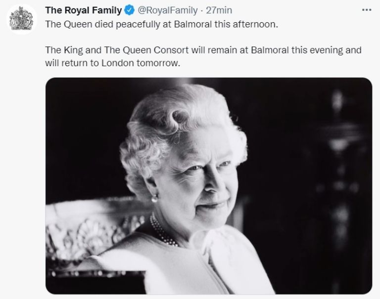 “La reina murió pacíficamente en Balmoral esta tarde. El Rey y la Reina Consorte permanecerán en Balmoral esta noche y regresarán a Londres mañana”, escribieron en la cuenta de Twitter.