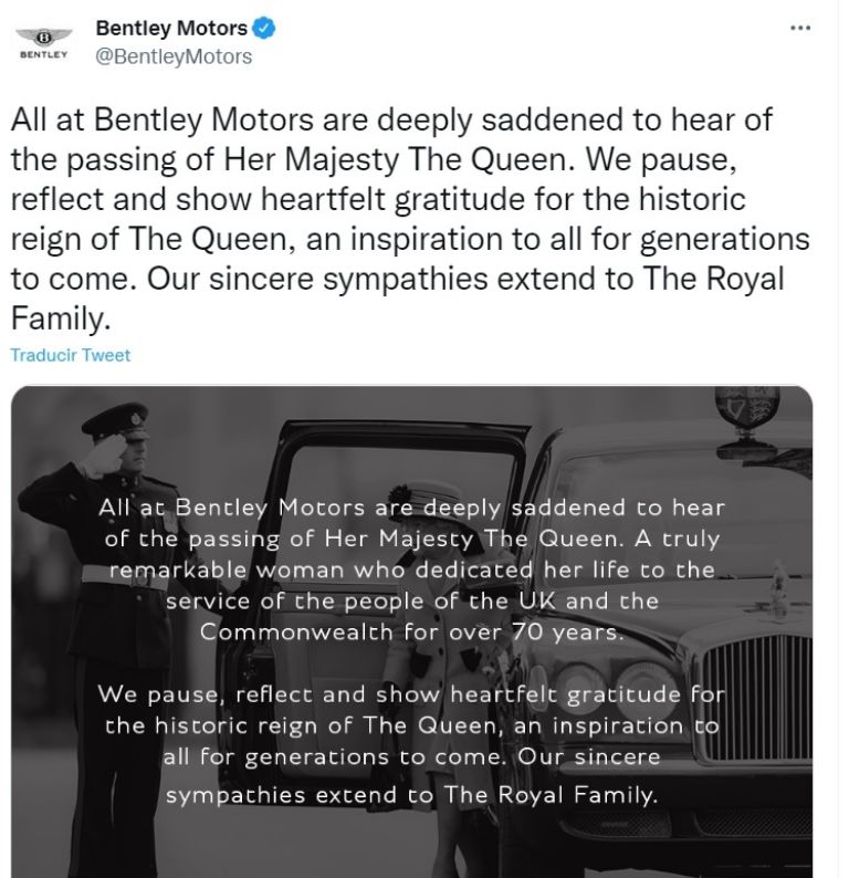 "Todos en Bentley Motors estamos profundamente entristecidos al enterarnos del fallecimiento de Su Majestad la Reina. Hacemos una pausa, reflexionamos y mostramos una sincera gratitud por el histórico reinado de La Reina, una inspiración para todas las generaciones venideras. Nuestras sinceras condolencias se extienden a la Familia Real", escribieron.
