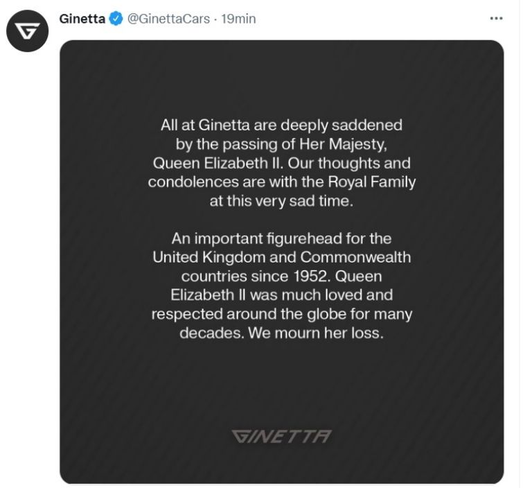 Tras darse a conocer la noticia, las condolencias del mundo automovilístico no se hicieron esperar, algunas marcas como Bentley Motors y Ginetta lamentaron el fallecimiento de la monarca a través de sus cuentas oficiales: