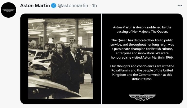 Aston Martin acompañó sus condolencias con una fotografía blanco y negro de la reina Isabel II visitando una de sus fábricas.
