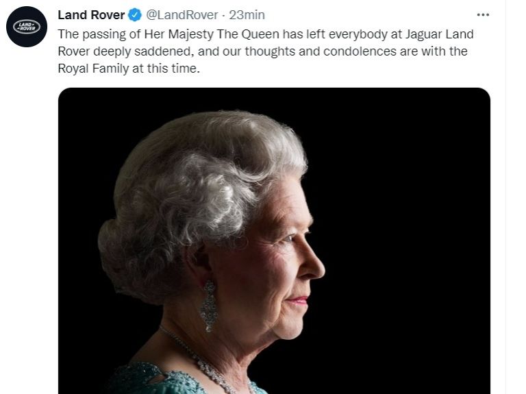 Land Rover escribió en su cuenta de Twitter: "El fallecimiento de Su Majestad la Reina ha dejado a todos en Jaguar Land Rover profundamente entristecidos, y nuestros pensamientos y condolencias están con la Familia Real en este momento".