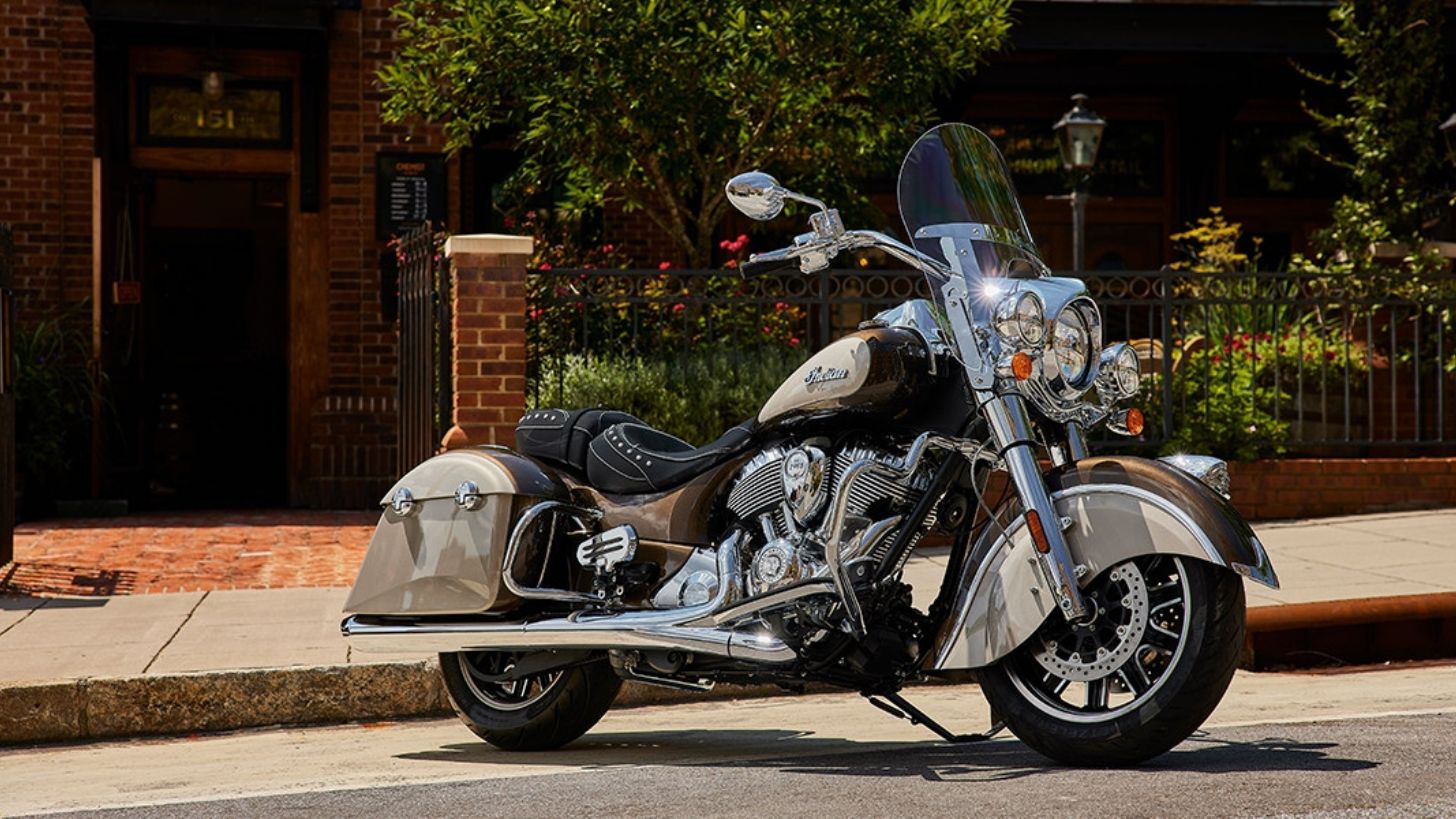 El modelo de motocicleta Indian Springfield es totalmente clásico y mantiene con vida el estilo norteamericano. Lo que resalta y gusta entre los motociclistas es su logotipo Headdress que está colgado en la defensa delantera.