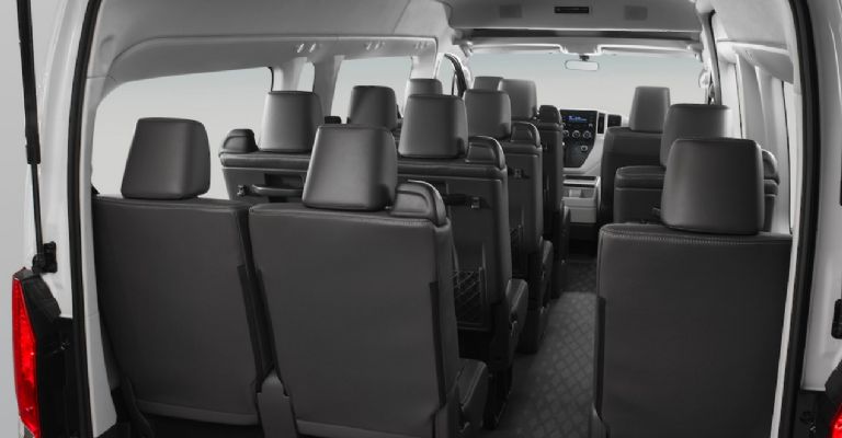 Las dimensiones interiores de la Toyota Hiace ofrecen un espacio altamente confortable para hasta 16 pasajeros (dependiendo de la versión).