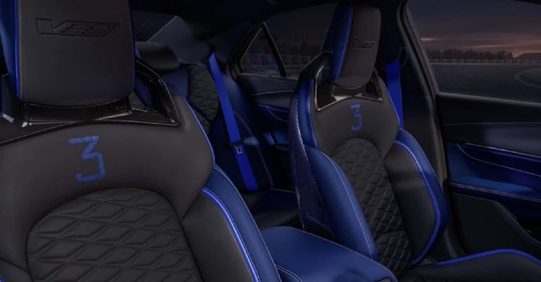 En el interior, tiene detalles en azul y un número tradicional "2" grabado en los respaldos de los asientos, así como placas de umbral personalizadas con el mismo diseño de número tradicional.