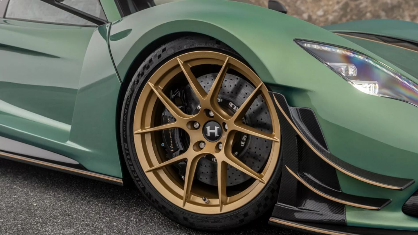 Llantas pintadas y pinzas de freno azules con logotipos de Hennessey blancos; este y el modelo Elemental Green también tienen una insignia Stealth de aluminio de solo 8 micrones de grosor.