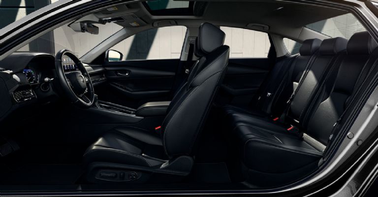 Al interior, el Honda Accord 2024 tiene vestiduras de piel, asientos delanteros y traseros calefactables, gran espacio para las piernas en los asientos traseros, con quemacocos eléctrico de tres posiciones de un solo toque con detección de obstáculos y una cabina amplia.