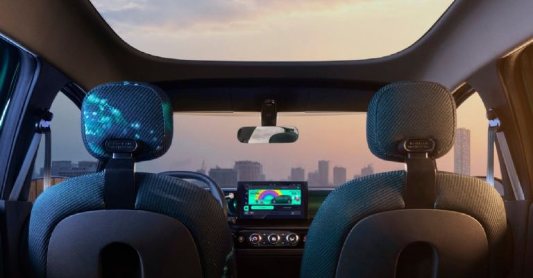 La tapicería original del prototipo eléctrico Twingo E-Tech se inspira en los motivos coloridos del modelo de primera generación. Combina con el color de la carrocería exterior, con toques sutiles en los paneles de las puertas delanteras y en el salpicadero orientado hacia el pasajero.