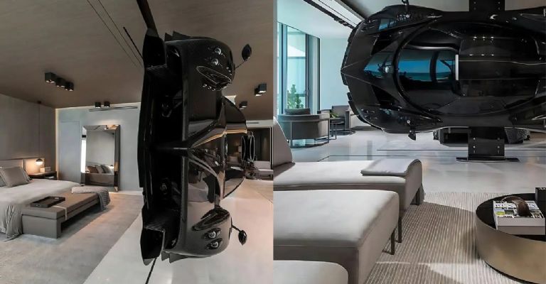 La pareja decidió que sería genial usar un Pagani Zonda Revolución negro elegante en su apartamento de Miami para convertirlo en una instalación de arte y un biombo.