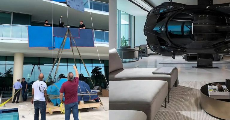 Un Pagani Zonda Revolución fue elevado con una grúa hasta un apartamento de Miami para convertirlo en un biombo único.