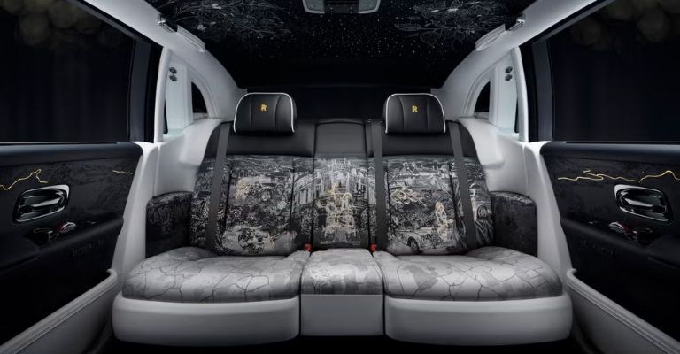 El bordado de alta calidad detalla la cronología del Phantom, desde su nacimiento en la antigua sede de Londres, pasando por sus modelos más clásicos, hasta cada una de sus generaciones. Incluso los detalles "secundarios", los asientos delanteros de cuero blanco exhiben bocetos grabados con láser, incluyendo una referencia al nombre en clave de la generación de 2003 ("Roger Rabbit").