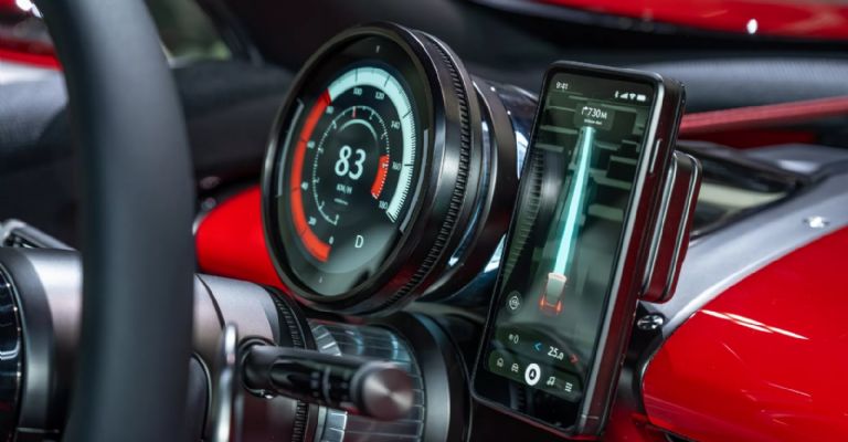El Vision-X Compact destaca por un diseño minimalista, una decisión en su interior: prescindir del sistema de infoentretenimiento tradicional y centrarse en la conectividad. Presenta un volante de base plana y un panel de instrumentos digital circular. El modelo prescinde del sistema de infoentretenimiento central y Mazda espera que los conductores utilicen sus propios smartphones como eje de la conectividad y navegación.
