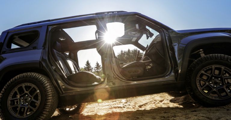 En cuanto al diseño exterior del Recon es inconfundible pero modernizado para la era eléctrica. Destaca la parrilla de siete ranuras, el sistema de iluminación premium LED de serie. Además que es el único SUV eléctrico en su segmento que ofrece puertas desmontables, incluyendo la puerta batiente trasera y los cristales laterales, todo sin necesidad de herramientas.