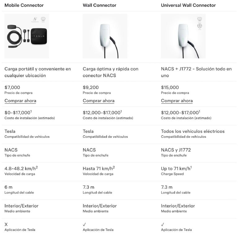 Esto varía dependiendo del tipo de cargador que elijas, la fuente de energía y la instalación especializada, a continuación te compartimos una tabla de Tesla, que muestra el precio de cada cargador disponible y el costo por su colocación: