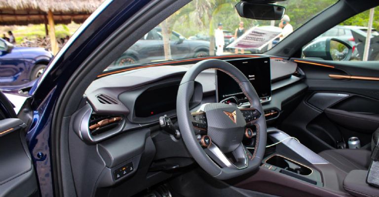 El interior es una delicia, es cómodo, audaz y con todo el ADN CUPRA, hasta las rejillas del aire acondicionado tienen elementos en cobre y con las líneas del logo de la marca, dándole una apariencia audaz.