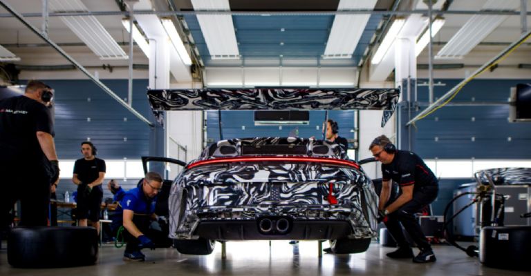 La fase de desarrollo comenzó en enero de 2024 e incluyó pruebas en circuitos exigentes como Monza, el Lausitzring y la pista interna de Weissach; entre los pilotos de prueba participaron figuras como Bastian Buus, campeón de la Supercup 2023, y Laurin Heinrich, campeón IMSA GTD Pro 2024.