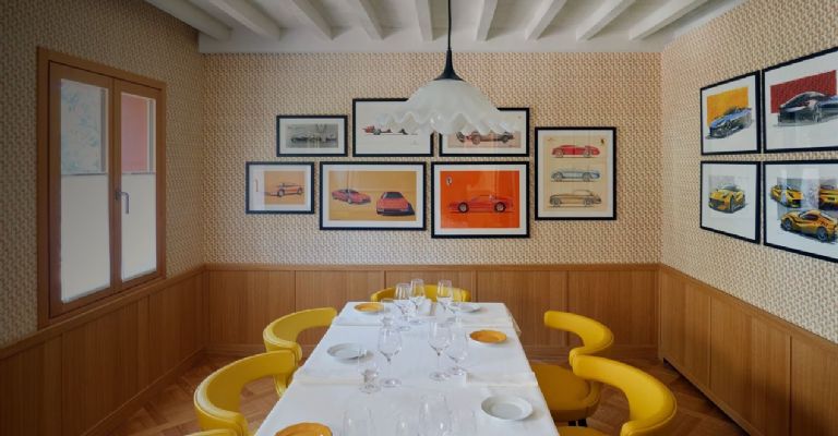 El edificio original ha sido revitalizado respetando su identidad histórica, pero con una mirada contemporánea; el rediseño incluye una colección exclusiva de recuerdos y piezas históricas redescubiertas en los archivos de Ferrari, que ahora se exhiben al público a lo largo del restaurante, sus salones, jardín y terraza.
