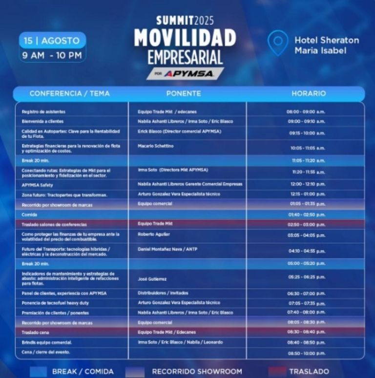 Con el objetivo de transformar la gestión de flotillas y mejorar la eficiencia operativa del sector, APYMSA empresa mexicana, líder en la distribución de autopartes y refacciones para vehículos celebró su primer Summit de Movilidad Empresarial 2025, reuniendo a tomadores de decisiones del transporte, talleres, proveedores y expertos en innovación. En el evento se abordaron los principales desafíos que enfrenta la industria, desde el abastecimiento oportuno de refacciones hasta el futuro de la electro-movilidad.