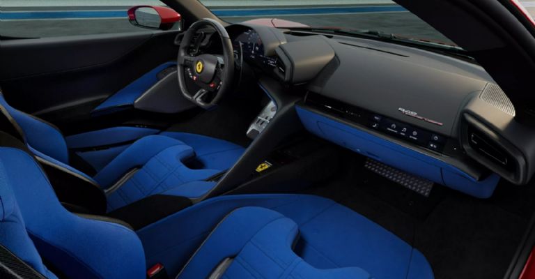 La cabina está inspirada en el F80, lo notamos con el selector de marchas que parece una transmisión manual de la época noventera. El volante reemplaza los controles táctiles por controles físicos. Una consola central separa al conductor del pasajero, y las pantallas digitales muestran información del performance para el conductor e información para el pasajero. Los clientes pueden elegir entre asientos de tipo cubo tapizados en cuero genuino o un asiento de carreras con cinturon de 5 puntos.