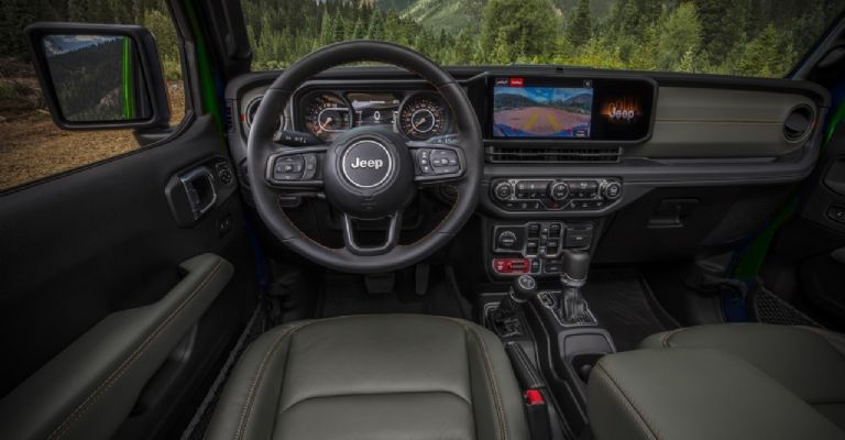 La cabina incorpora asientos delanteros con ajuste eléctrico de 12 posiciones y el sistema de infoentretenimiento Uconnect 5, que se gestiona a través de una pantalla táctil de 12.3 pulgadas, la más grande jamás ofrecida en un Wrangler. El sistema también cuenta con conectividad inalámbrica para Apple CarPlay y Android Auto, y un sistema de reconocimiento de voz mejorado.