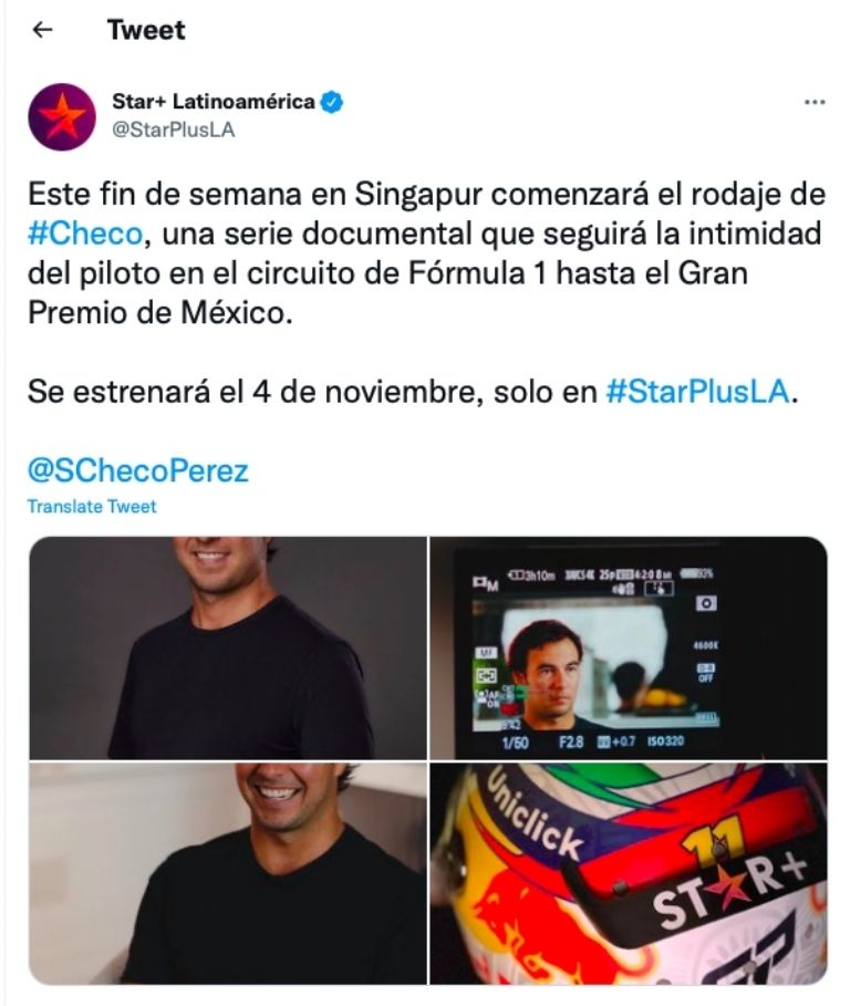 La fecha de estreno de Checo está agendada para el 4 de noviembre de este año a través de Star+ Latinoamérica, por la cual también se tiene que pagar una cuota de suscripción mensual.