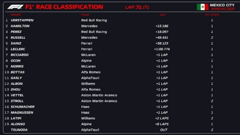 Pese a los intentos del tapatío de coronarse campeón en su tierra, prácticamente toda la carrera se mantuvo en el tercer sitio, por detrás de su compañero de escudería, Max Verstappen y el siete veces campeón del mundo de Mercedes, Lewis Hamilton.