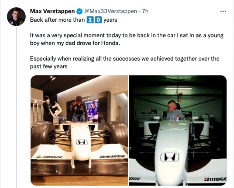 Como parte de un hilo de dos partes, Max Verstappen agradeció a Honda por haberle permitido revivir los recuerdos de su niñez, y sin pensarlo dos veces, recreó una fotografía que causó gran ternura entre los internautas en la que se le ve con las manos al volante y el rostro ligeramente hacia un lado: “Gracias Honda por hacer todo esto posible. Nos vemos en la pista este fin de semana”.