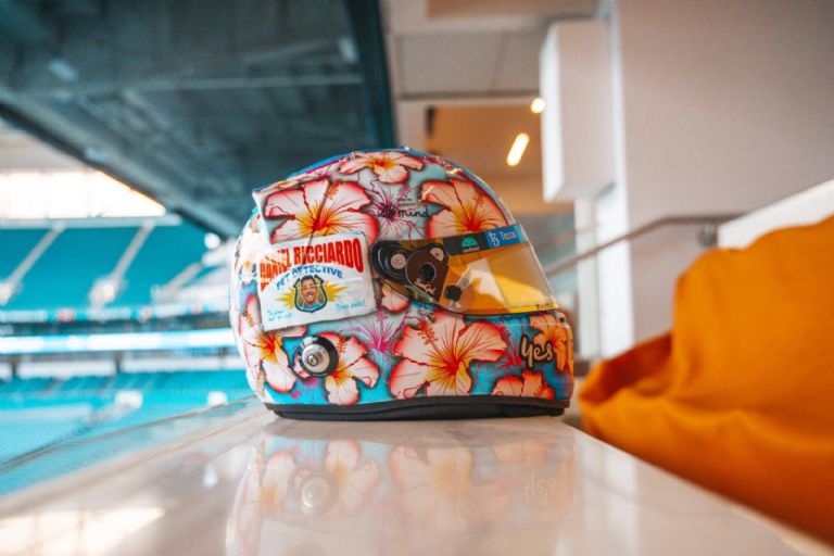 Los cascos que representan al GP Miami, magno evento de la Fórmula 1