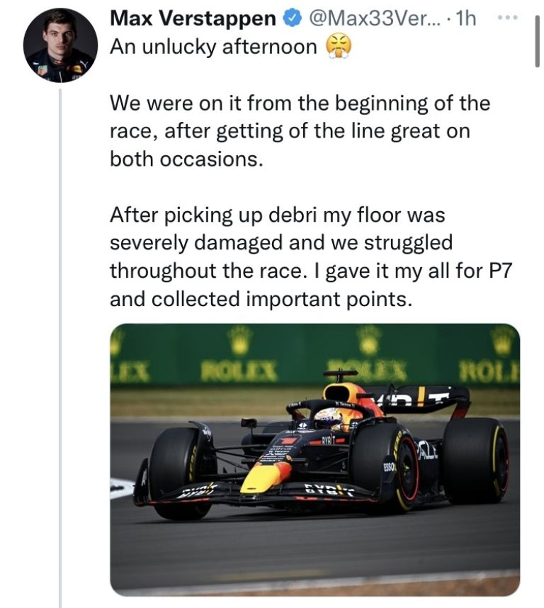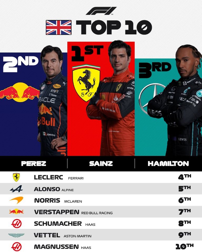 52 vueltas más tarde el español Carlos Sainz cruzaba la linea de meta para conseguir su primera victoria en F1, convirtiéndose en el piloto número 40 en lograrlo a bordo de un Ferrari, detrás de el Checo Pérez con un segundo lugar de ensueño y más atrás Lewis Hamilton con un tercer puesto que sabía a gloria para Mercedes y para la gran afición del GP de Gran Bretaña.