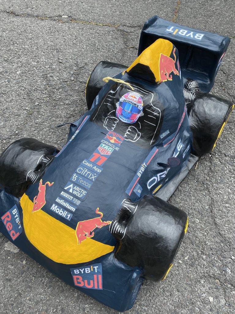 “Mi hijo es fan de la F1 y de Checo Pérez y me pidió un cumpleaños temático de Red Bull Racing, así que conseguí una piñata con forma de monoplaza, la repinte y le hice calcomanías de los patrocinadores. No están el 100% de las marcas, pero trate de ponerle la mayoría”