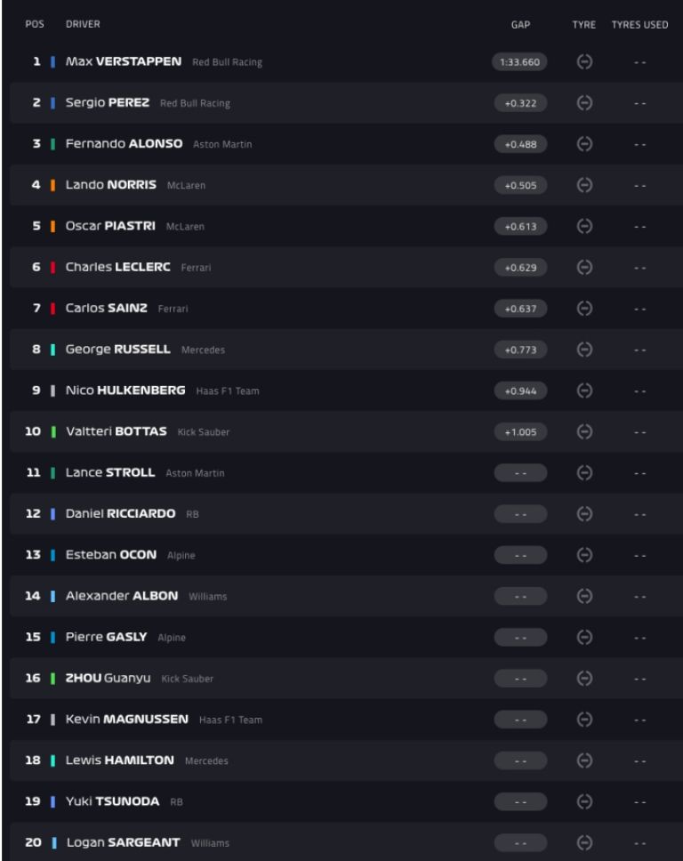 Fue una gran actuación del equipo de las bebidas energéticas, pues Max Verstappen se llevó el primer lugar, pues marcó el mejor tiempo con un 1:34.742, mientras que Checo Pérez se posicionó segundo y Fernando Alonso quedó en tercero.