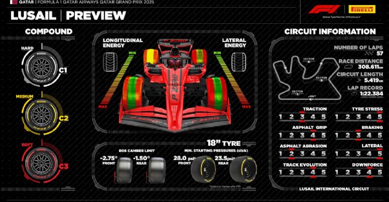 Para esta edición del GP de Catar, Pirelli y la FIA han implementado una norma especial: cada juego de neumáticos de seco no podrá superar las 25 vueltas en total, contando todas las sesiones (entrenamientos, sprint, carrera).