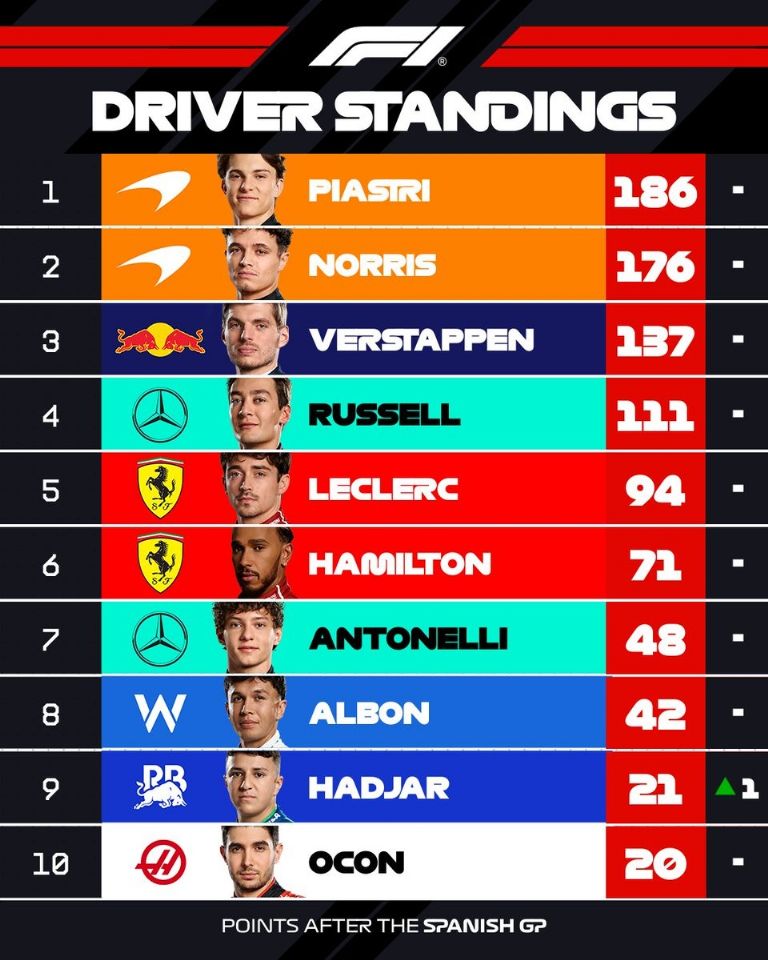 Oscar Piastri obtuvo la victoria y llegó a 186 puntos. Mientras que su compañero de equipo, Lando Norris, finalizó segundo en la carrera y mantiene la segunda posición en la clasificación con 176 puntos.