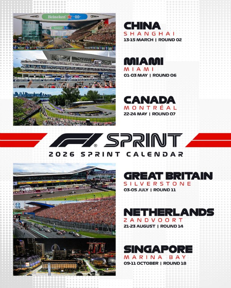 Los Grandes Premios que albergarán Sprint en 2026 serán los siguientes: China (Shanghai) del 13 al 15 de marzo; Estados Unidos (Miami) del 1 al 3 de mayo; Canadá (Montreal) del 22 al 24 de mayo; Gran Bretaña (Silverstone) del 3 al 5 de julio; Países Bajos (Zandvoort) del 21 al 23 de agosto; y Singapur (Marina Bay) del 9 al 11 de octubre.