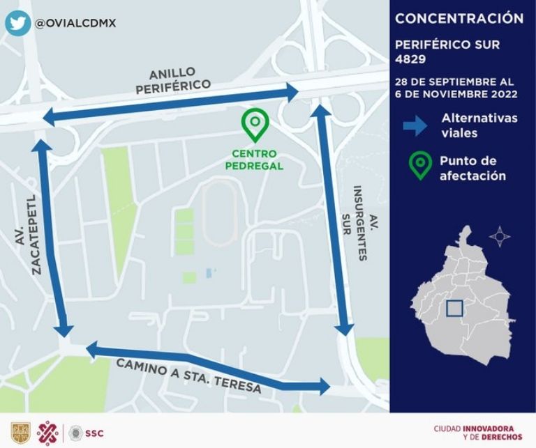 - A partir de las 08:00 horas considera concentración de manifestantes hasta el 06 de noviembre en Anillo Periférico #4829, col. Parques del Pedregal, alcaldía Tlalpan, por evento. La alternativa vial es: