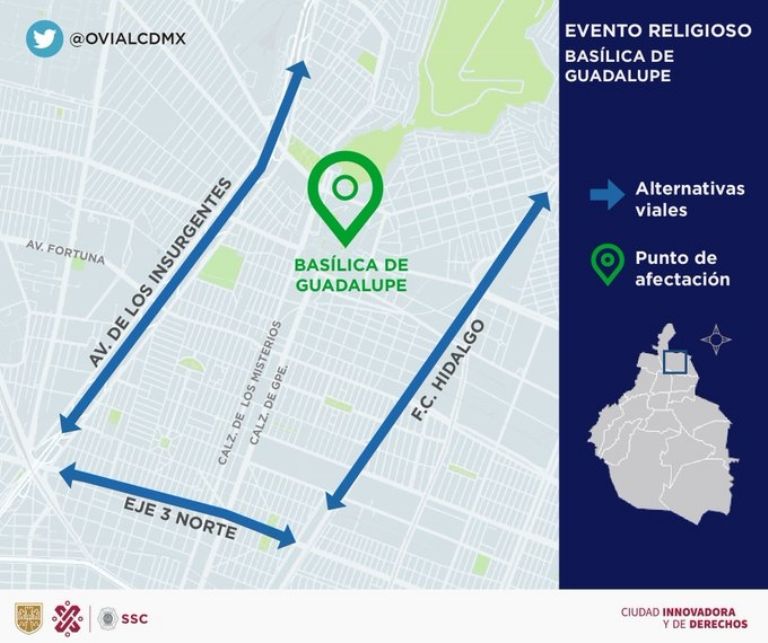 - Por arribo de feligreses considera afectación en inmediaciones de la Basílica de Guadalupe, alcaldía Gustavo A. Madero. Las vías alternas son: