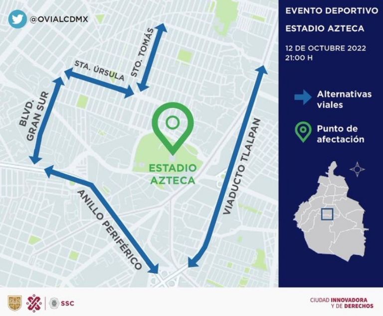 - Alas 21:00 horas, se llevará a cabo evento deportivo en el Estadio Azteca, alcaldía Coyoacán. Considera afectación en inmediaciones. Las opciones viales son: