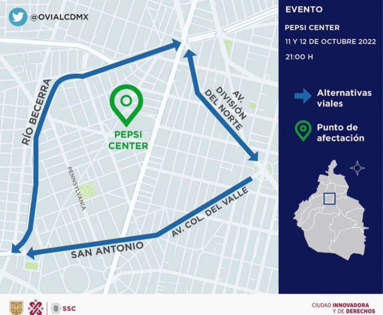 - Este 11 y 12 de octubre a las 21:30 se llevará a cabo evento en el Auditorio Pepsi Center, en la alcaldía Benito Juárez, considera afectación vial en inmediaciones. Las vías alternas son: