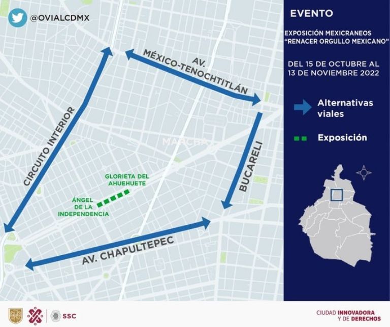- Se lleva a cabo la Exposición Mexicráneos “Renacer Orgullo Mexicano” del 15 de octubre al 13 de noviembre de 2022, sobre Av. Paseo de la Reforma, entre las Glorietas del Ángel de la Independencia y El Ahuehuete. Las opciones viales son: