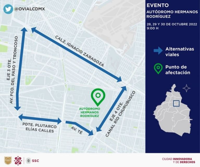 El GP de México se llevará a cabo este 28, 29 y 30 de octubre, las afectaciones viales serán entre las 09:00 y las 20:00 horas, sobre todo, en las inmediaciones del Autódromo Hermanos Rodríguez, ubicado en la alcaldía Iztacalco.