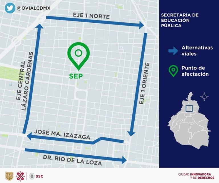 - Continúa bloqueada la circulación en República de Brasil a la altura de Luis González Obregón, col. Centro, alcaldía Cuauhtémoc, por manifestantes. Las alternativas viales son: