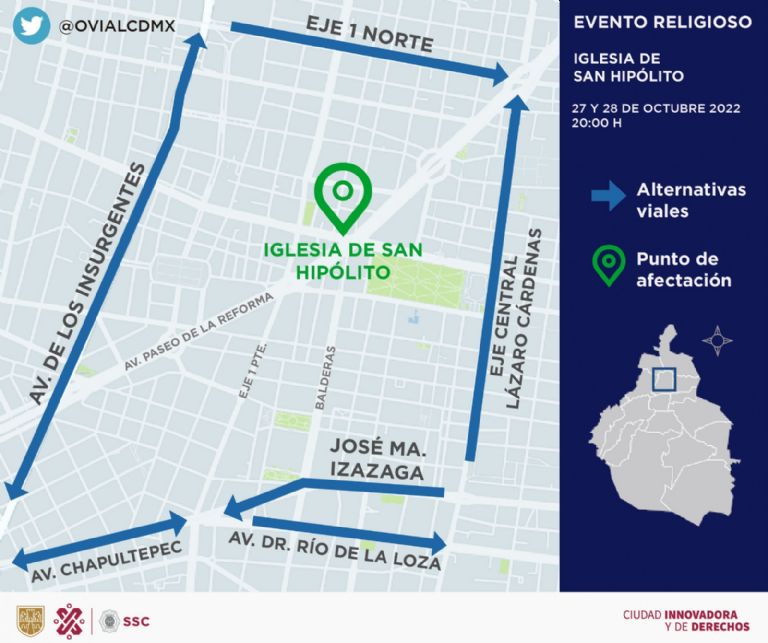 - Cerrada la circulación en lateral de Paseo de la Reforma desde Violeta hasta Rosales y Av. Hidalgo desde Eje 1 Poniente hasta Reforma, por arribo de feligreses a la iglesia de San Hipólito. Las opciones viales son: