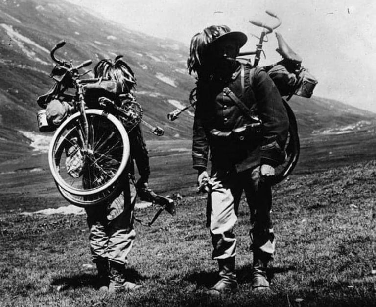 Durante la Primera Guerra Mundial era común que soldados italianos (conocidos como infantería ciclista) llevaran en sus espaldas bicicletas plegables de la reconocida marca Bianchi. Para esas épocas de 1914 a 1918, tiempo que duró la confrontación, las bicis eran robustas y pesadas.