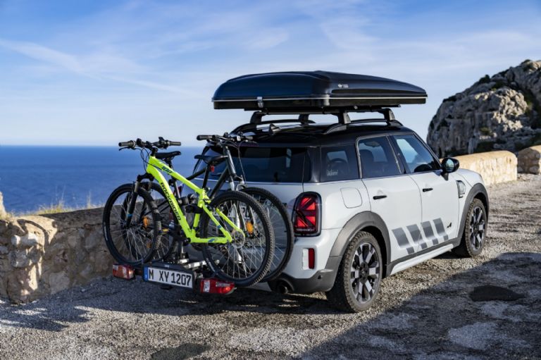 El segundo accesorio disponible para este todo terreno cortesía de MINI, es el portabicicletas plegable que se instala en la parte trasera del vehículo, y que puede cargar cómodamente dos bicicletas de montaña sin ningún problema.