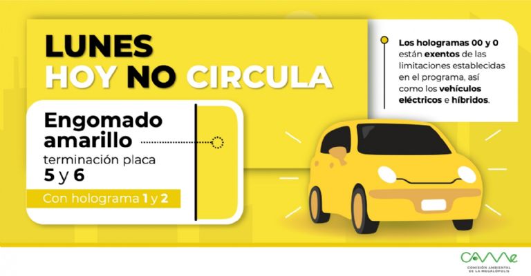 Este lunes 23 de mayo 2022, el programa Hoy No Circula aplica para los carros que tienen engomado amarillo, terminación de placa 5 y 6 en las 16 alcaldías de la Ciudad de México (CDMX) y 18 municipios conurbados del Estado de México (Edomex).